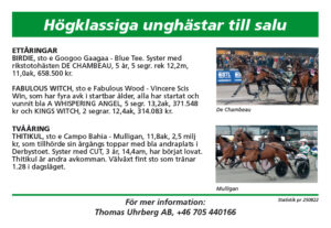 MULLIGANS första avkommor är CUT född 2022 och THITIKUL född 2023 och ÅBERG född 2024. Vårt tredje sto BLUE TEE, 12,7a, 267.000 kr har två avkommor i startbar ålder BISCUIT, 12,3M, 476.000 kr, DE CHAMBEAU 12,2 m, 472.000 kr som vunnit på rikstoton. Hennes övriga avkommor är SWEETSPOT, född 2022 med Traders och BIRDIE född 2024. Vi har även hand om VINCERE SCIS VIN som bl a har KINGS WIZARD hingst f 2023 som är helbror med KINGS WITCH, 12,4a/1640m, 254.000 kr och föl född 2024 efter Fabolous Wood.